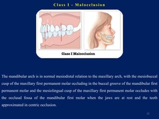 Class I has normal molar occlusion but other teeth may have crowding or eruption over or under its intended place. Same as normal occlusion but characterized by crowding rotations and other positional irregularities. Maxillary canine is in between md canine and 1st premolar.